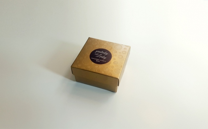 Velmi elegantní ochutnávkové balení 4 ks pralinek mix ve zlaté krabičce s víčkem a jemným kruhovým reliéfem.
