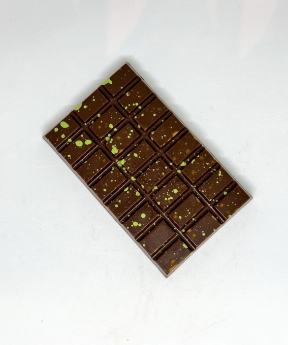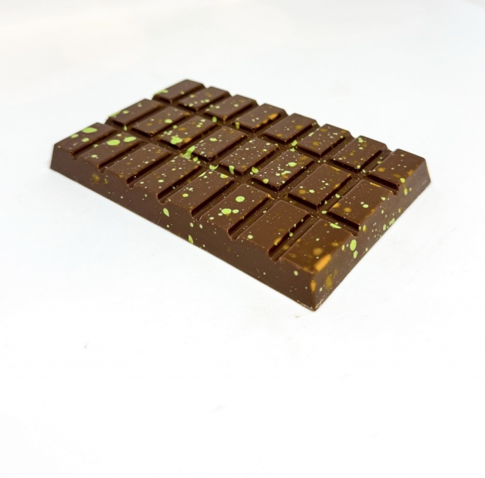 Ponořte se do světa orientálních chutí s naší čokoládou DUBAI VIBES. Jemná mléčná čokoláda ukrývá křupavé kadayifi nitky a krém z pistácií, které vám přinesou autentický zážitek jako z honosného dubajského paláce.