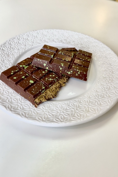 jemný pistáciový krém, kadayif a tahini v mléčné čokoládě