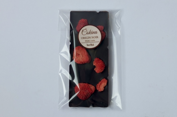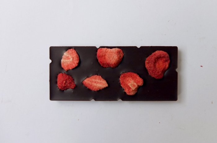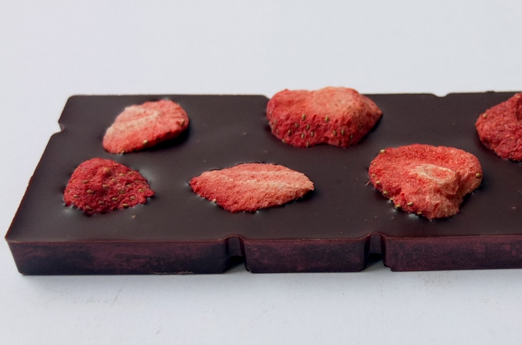 Tabulková čokoláda z tmavé čokolády s přidanou lyofilizovanou jahodou.