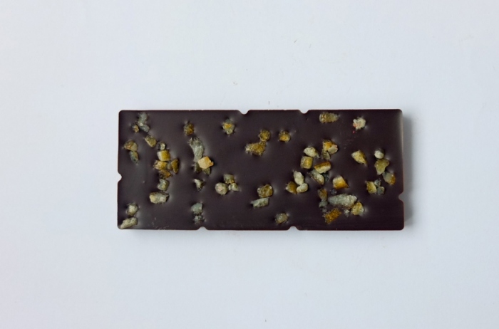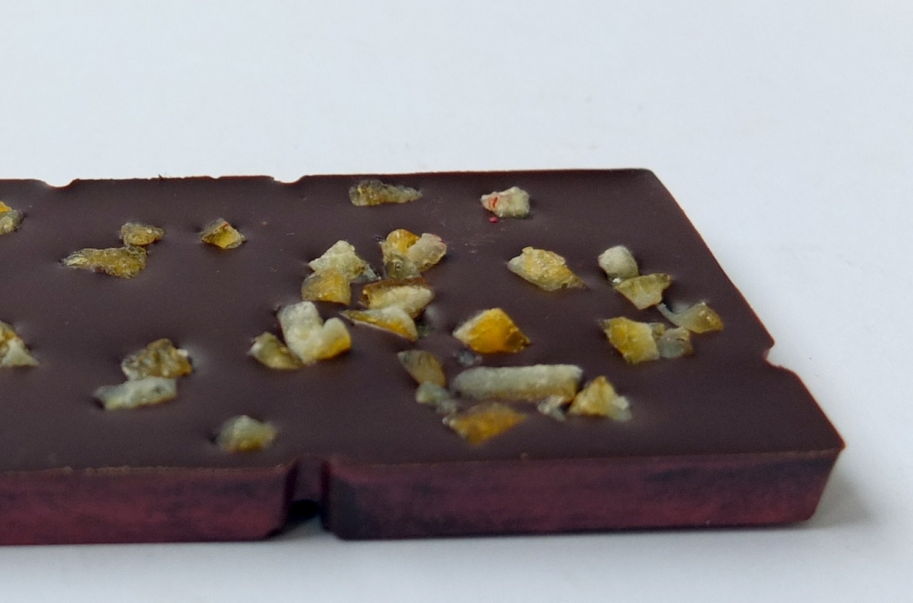 Tabulková čokoláda z mléčné čokolády s přidanou kandovanou pomerančovou kůrou.