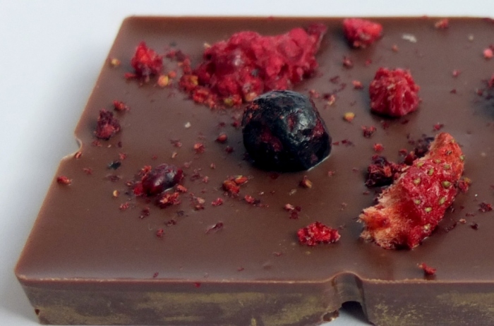 lyofilizovaná (mrazem sušená) směs ovoce (1%) (jahody, maliny, černý rybíz v různém poměru), mléčná čokoláda (kakaová hmota (35,5%), cukr, kakaové máslo, sušené plnotučné mléko, emulgátor sójový lecitin E322, aroma: přírodní vanilka); barva: barevný prach AF - bez AZO barviv (protispékavé činidlo: E555, barvivo: E172 (bronz, červená); E172 (zlatá)