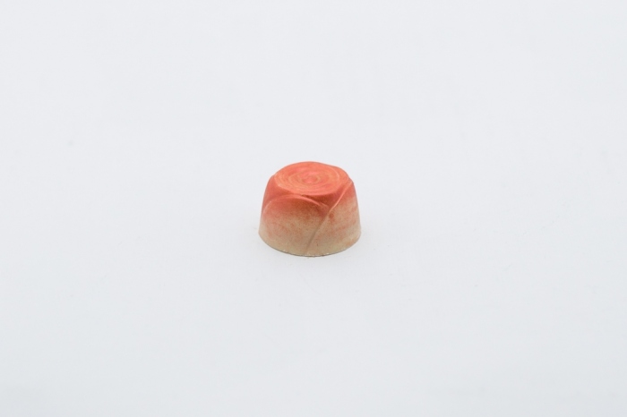 skořápka: mléčná čokoláda (kakaová hmota Vietnam (45%), cukr, kakaové máslo, sušené plnotučné mléko, aroma: přírodní vanilka); náplň: ovocné pyré jahoda (32%), bílá čokoláda (kakaové máslo (28%), cukr, sušené plnotučné mléko, emulgátor sójový lecitin E322, aroma: přírodní vanilka), smetana; barva: barevný prach AF - bez AZO barviv (protispékavé činidlo: E555, barvivo: E172 (bronz, červená)