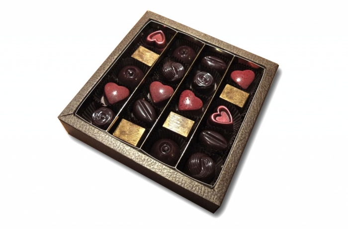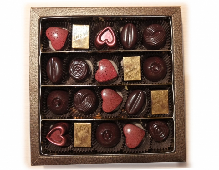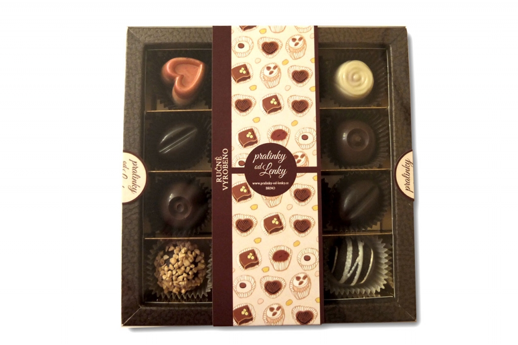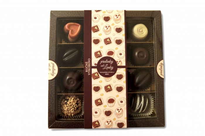 20 ks pralinek mix v luxusní krabičce se vzorem hnědá "kůže". Bonboniéra obsahuje mix pralinek, které jsou zrovna čerstvě vyrobené.
