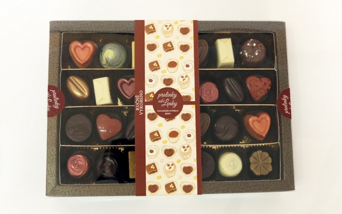 28 ks pralinek mix v luxusní krabičce se vzorem hnědá "kůže". Bonboniéra obsahuje mix pralinek, které jsou zrovna čerstvě vyrobené.